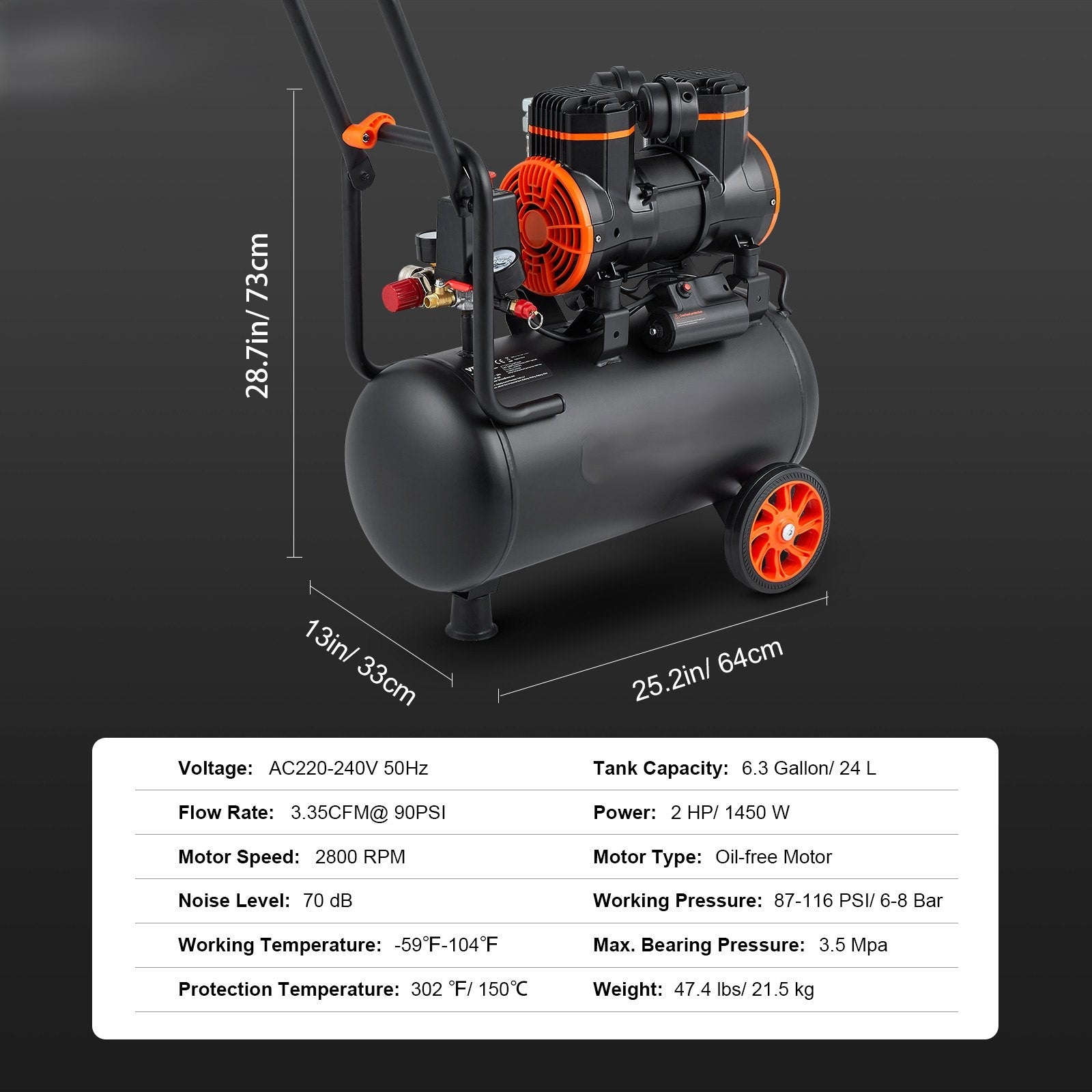 Gör dig redo att vara förberedd för alla utmaningar! Vår oljefria luftkompressor på 24 liter kan hantera flera scenarier, såsom däckpumpning, bilreparation, spraymålning och snickeriarbeten. Den 1450W starka motorn med en hastighet på 2800 r/min och ett luftflöde på 95 liter per minut vid 6,2 bar fyller snabbt upp tanken.